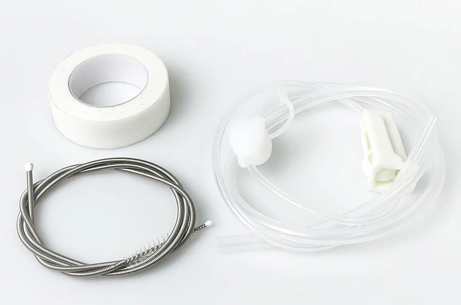 Contents: 1 x Inlet Tube, 1 x Outlet Tube, 1 x Tube Adapter, 1 x Flow Controller, 1 x Cleaning Brush, 1 x Medical Tape, 1 x Carry Case