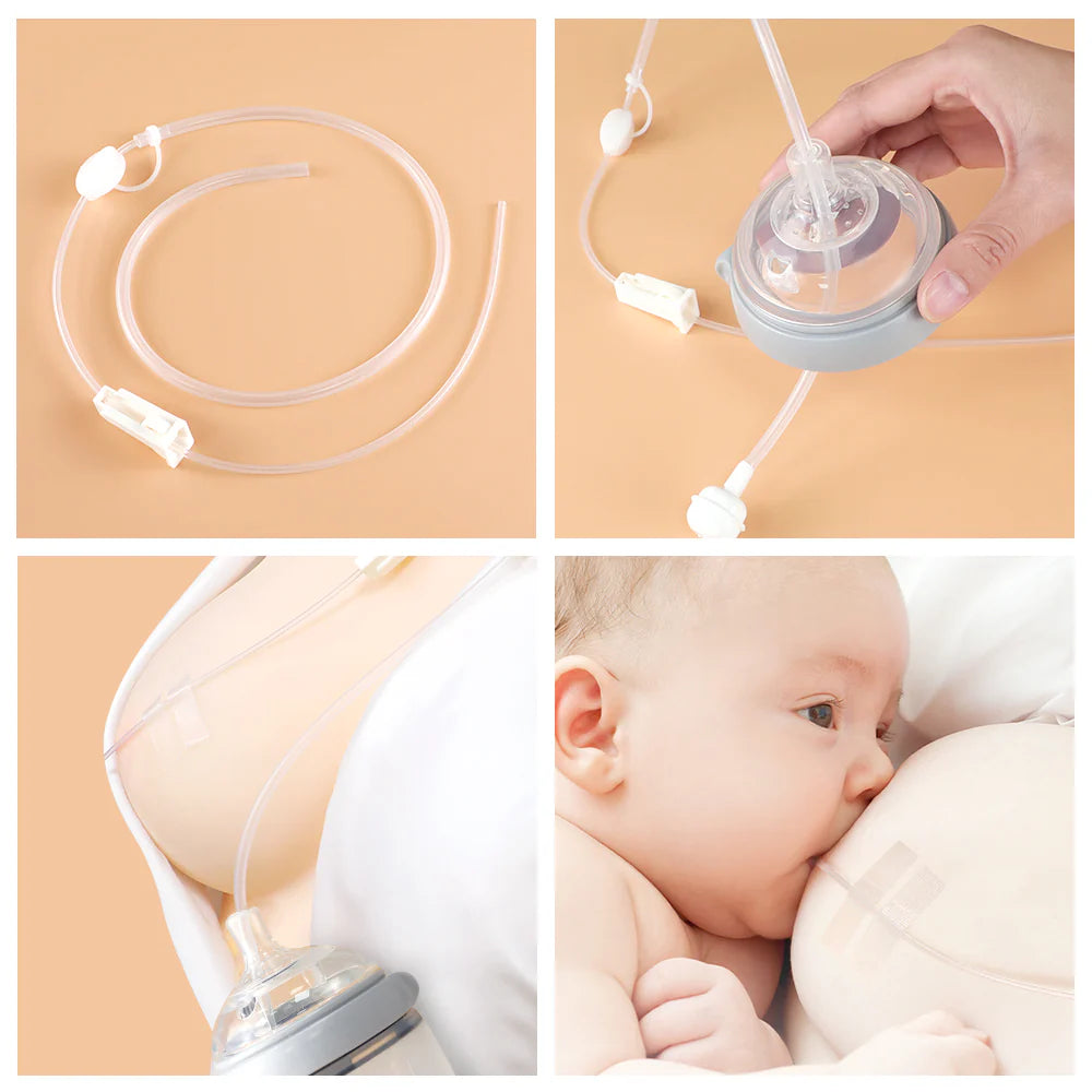 Many moms and their babies experience feeding issues – including latching problems, low milk supply, or maybe little ones that need a little extra nourishment or help to learn how to feed. The Silicone Feeding Tube Set helps you to overcome some of these common issues by connecting a bottle of supplemented milk to your breast via a tube, delivering a constant and controllable flow of milk to baby at the breast. Through the use of the Silicone Feeding Tube, both mother and baby can experience the natural physical sensation of breastfeeding, while encouraging mom’s supply and ensuring that baby receives adequate nutrition.