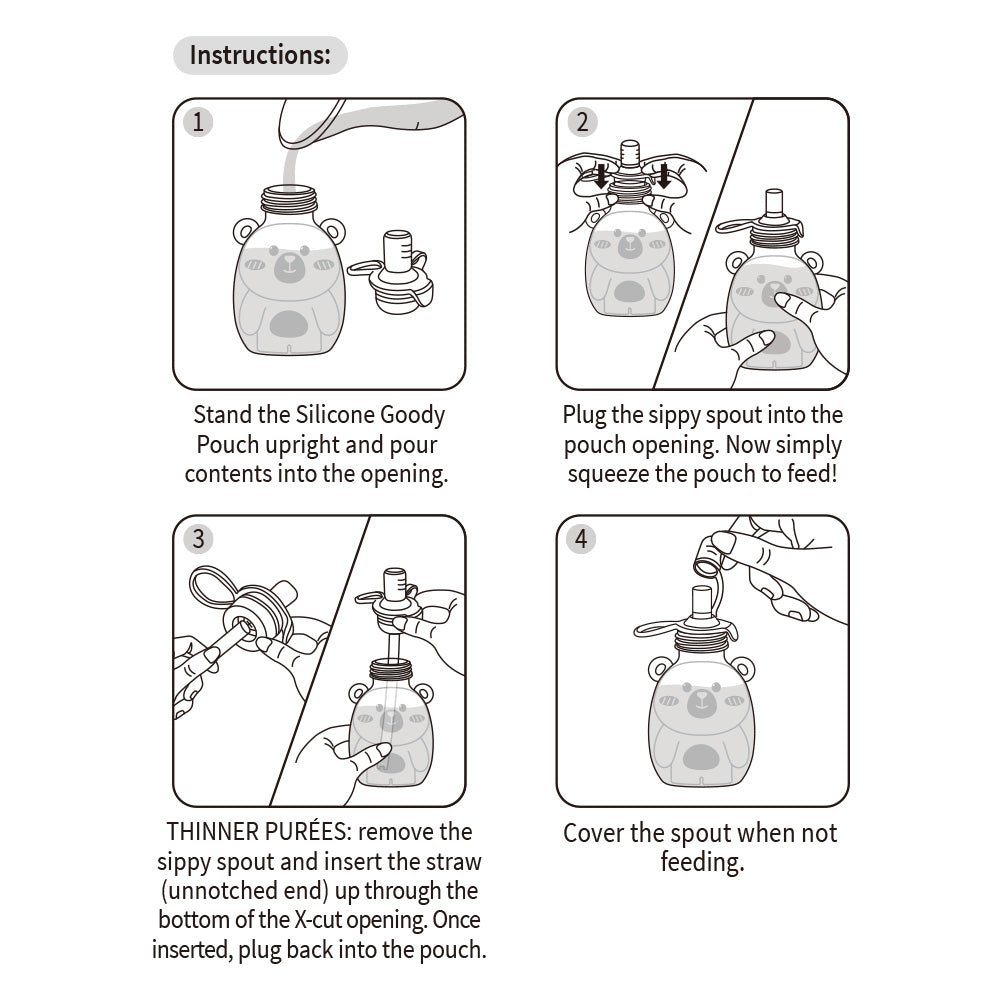 Hún er gerð úr 100% food-grade sílikoni sem má nota aftur og aftur. Fullkomin til að taka með sér heimagert mauk, boozt, jógúrt eða annað góðgæti á ferðina eða í göngutúrinn og til að eiga heima.
