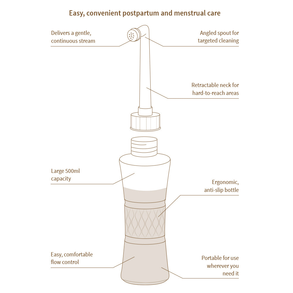 Með hentugu formi, hallandi stút og samanbrjótanlegum hálsi er einfalt að hreinsa viðkvæm svæði eftir fæðingu. Kreistanlega flaskan gerir þér kleift að stjórna vatnsflæðinu nákvæmlega eftir þörfum, og með 500 ml rúmtaki þarftu ekki að hafa áhyggjur af að vatnið klárist áður en þú ert búin. Hún kemur einnig með rykheldu loki og vatnsvarinni ferðatösku svo þú getir haft hana með þér hvert sem er.